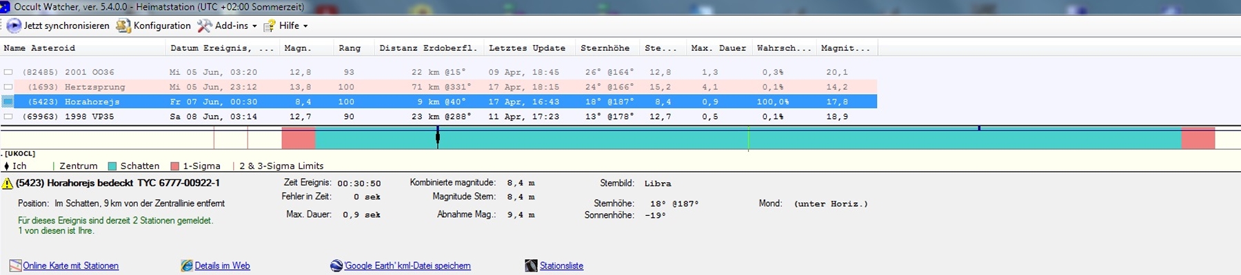 Bedeckung: ab 00:30:50 MESZ (+/- 0s); Dauer max. 0,9s / Abnahme 9,4 mag;