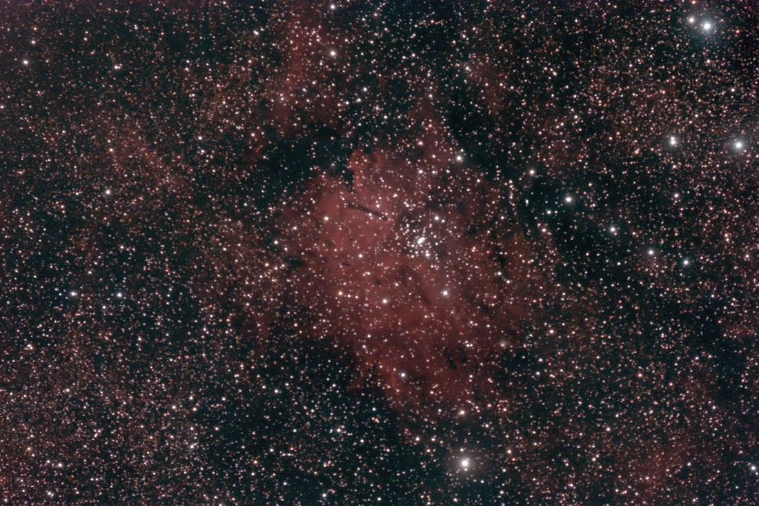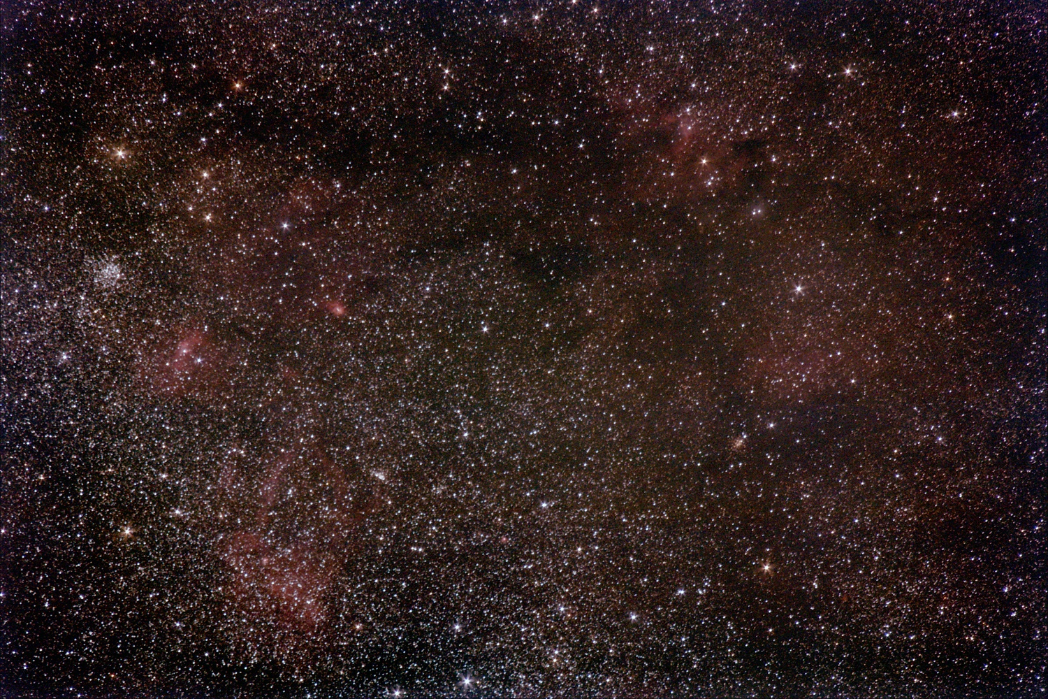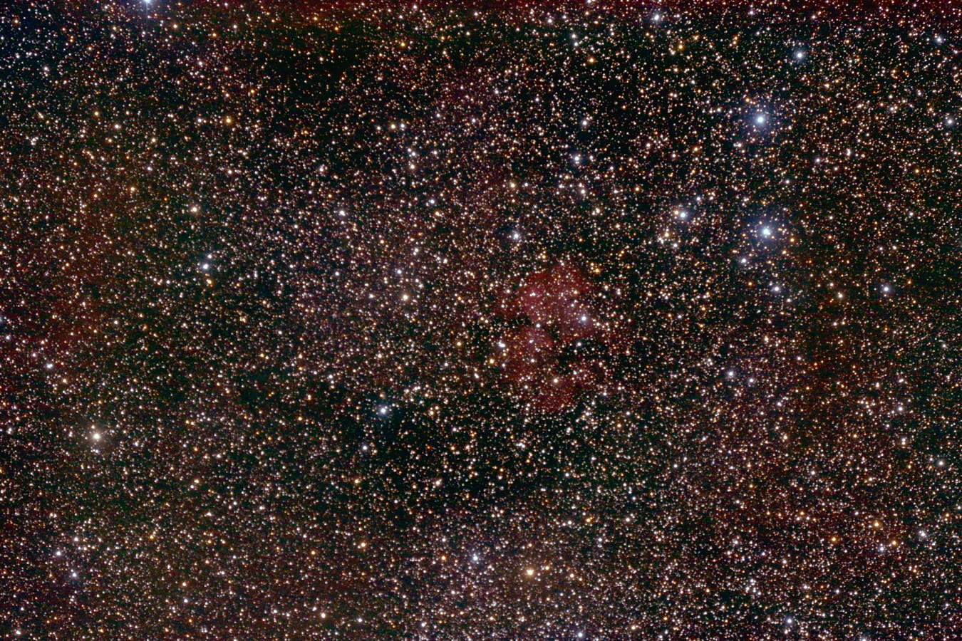 Die HII-Region, auch Kleiner Kokonnebel genannt, wird vom Gewirr der vielen Milchstraßensterne überstrahlt.